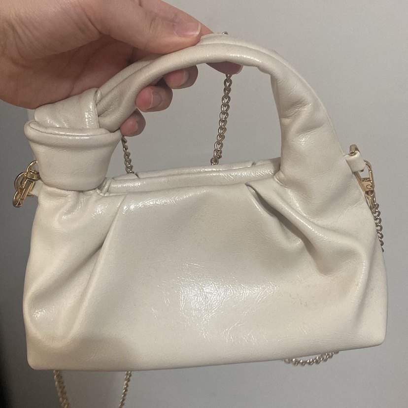 Zincir detaylı beyaz deri kadın çanta, yumuşak ve pürüzsüz dokuludur. Minimalist tasarımı günlük sokak stiline uygundur.