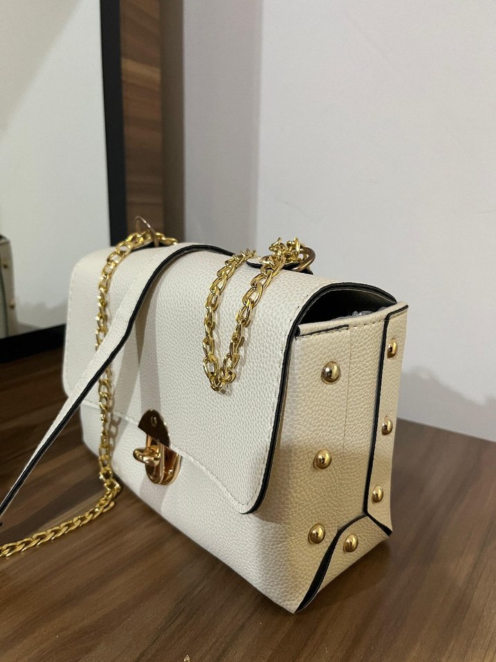 desenli beyaz deri kadın çantası, altın zincir detaylarıyla modern klasik