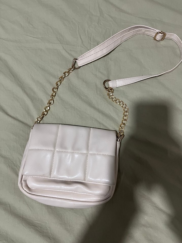 Zincir detaylı beyaz deri kadın çantası, pastel tonlarda ve desensizdir. Paris sokak modasına uygun, gündelik ve trend görünüme sahiptir.