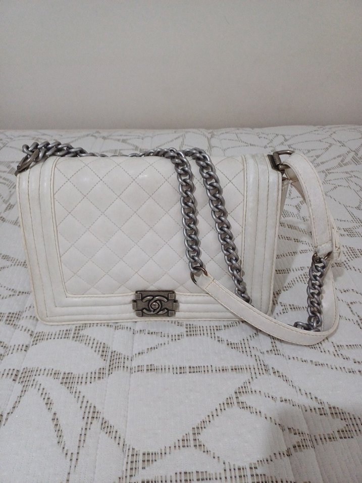 Modern klasik tarzda, zincir detaylı beyaz deri kadın çanta, günlük kullanım için Parisian şıklığı sunar.