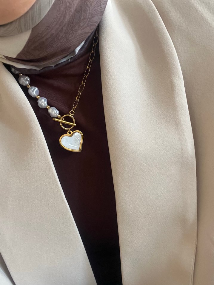 Zincir detaylı, inci ve kalp figürlü midi kolye, modern klasik tarzı Parisian zarafetiyle buluşturur.