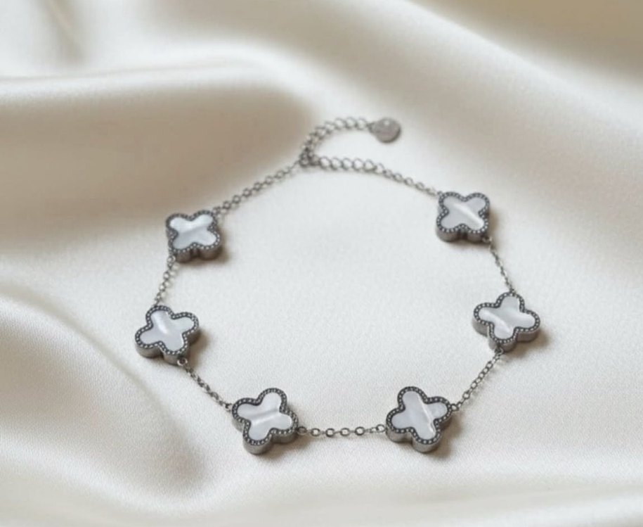 Minimalist tarzda zincir detaylı, beyaz işlemeli yonca figürlü kadın bileklik. Günlük kullanıma uygun, bohem esintili.