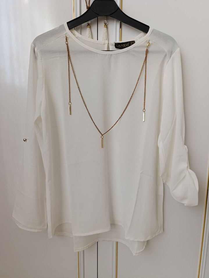 Zincir detaylı, beyaz kadın bluz. Uzun kollu, yuvarlak yaka ve ipeksi kumaştan, günlük kullanıma uygun minimalist tarzda marka temsili