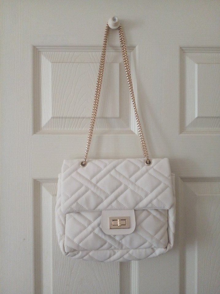 Zincir askılı, kapitone desenli beyaz kadın çantası. Modern klasik ve Parisian tarzını yansıtır. Temiz ürün.