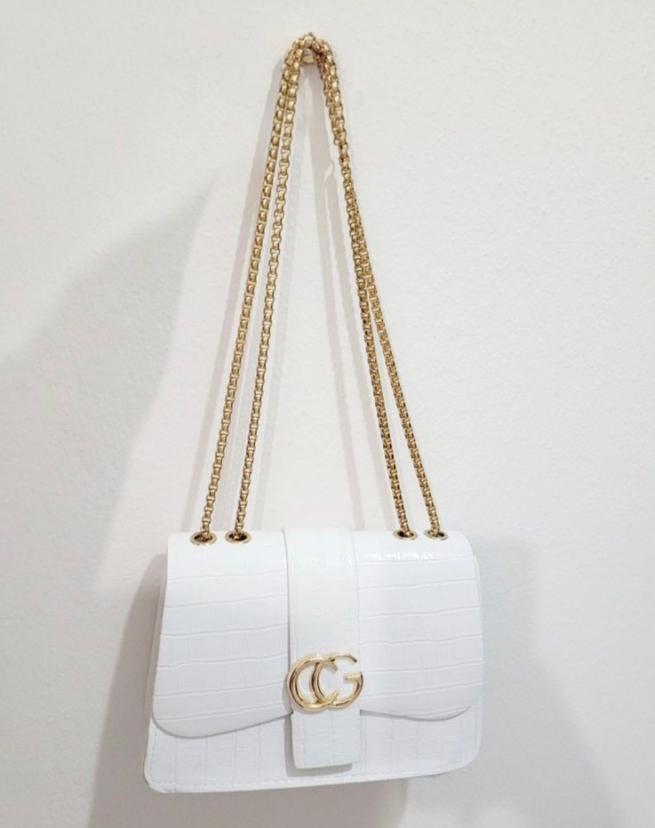 Parlak beyaz yılan derisi desenli kadın çanta, altın zincir detaylarıyla klasik ve minimalist sokak stilini yansıtıyor.