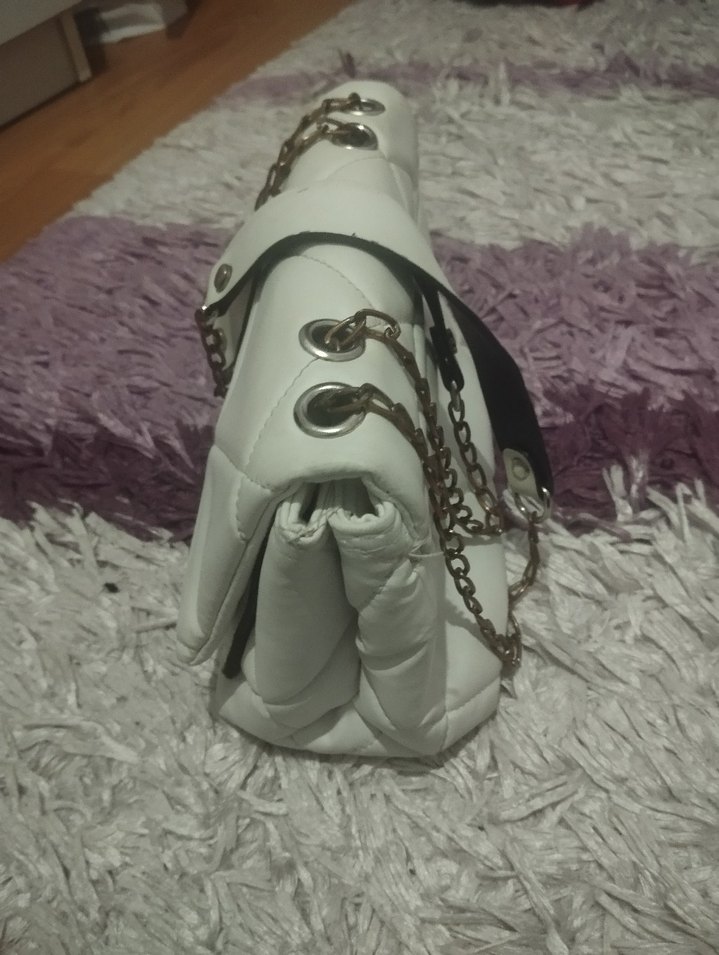 Sentetik kumaştan yapılmış, yılan derisi desenli ve zincir detaylı beyaz kadın çantası. Günlük kullanım için sokak stili ve rahat bir görünüme sahip.