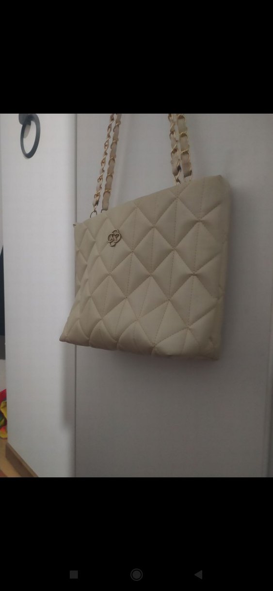 Yumuşak sentetik kumaştan yapılmış, zincir detaylı beyaz kadın çantası. Minimalist ve modern klasik tarzıyla günlük kullanıma uygundur.