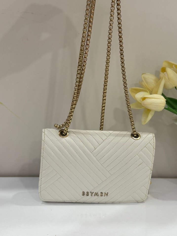 Ürün sadece bir defa kullanıldı yenidir Zincir askılı, beyaz deri kadın çanta. Minimalist, bohem tarzda, desenli ve BBYMEN marka yazılı. Günlük kullanıma uygun, klasik şıklık sunar.