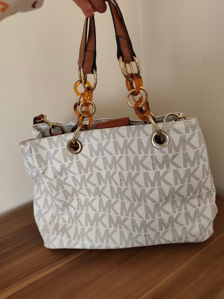 Zincir detaylı, gri yazili beyaz deri kadın çantası fazlaliktan satıştadır