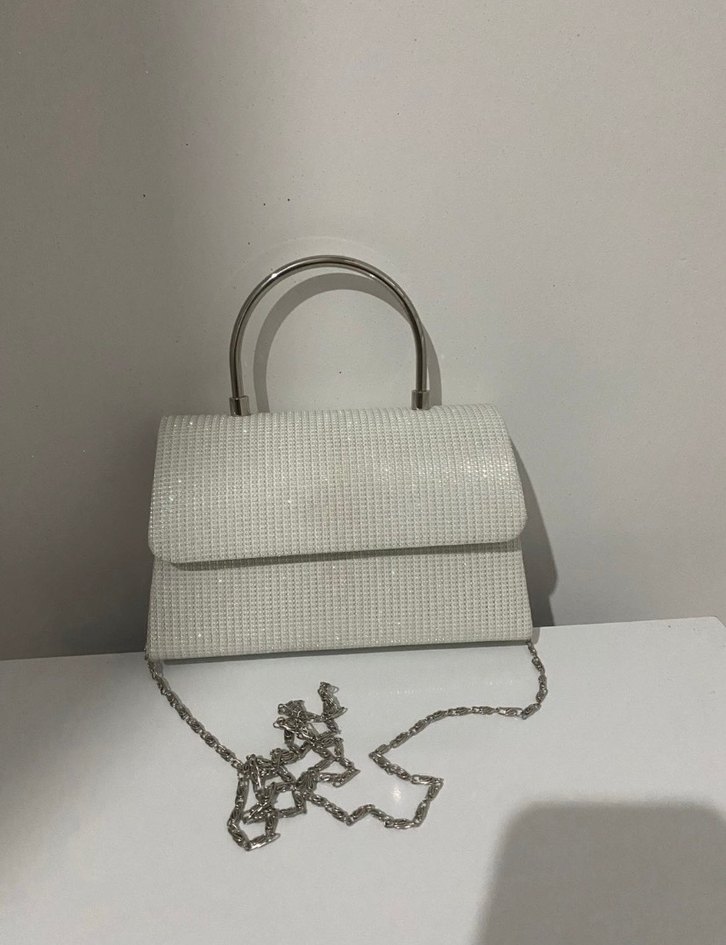 Zincir detaylı beyaz el çantasıdır. Özel gün abiye elbiseler için uygundur arkasında ufak ruj lekesi vardır