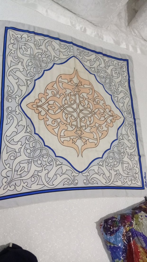 Zincir detaylı, beyaz renkte kadın fular. Hafif renkler ve bohem desenlerle sentetik kumaştan üretilmiştir. Silk home