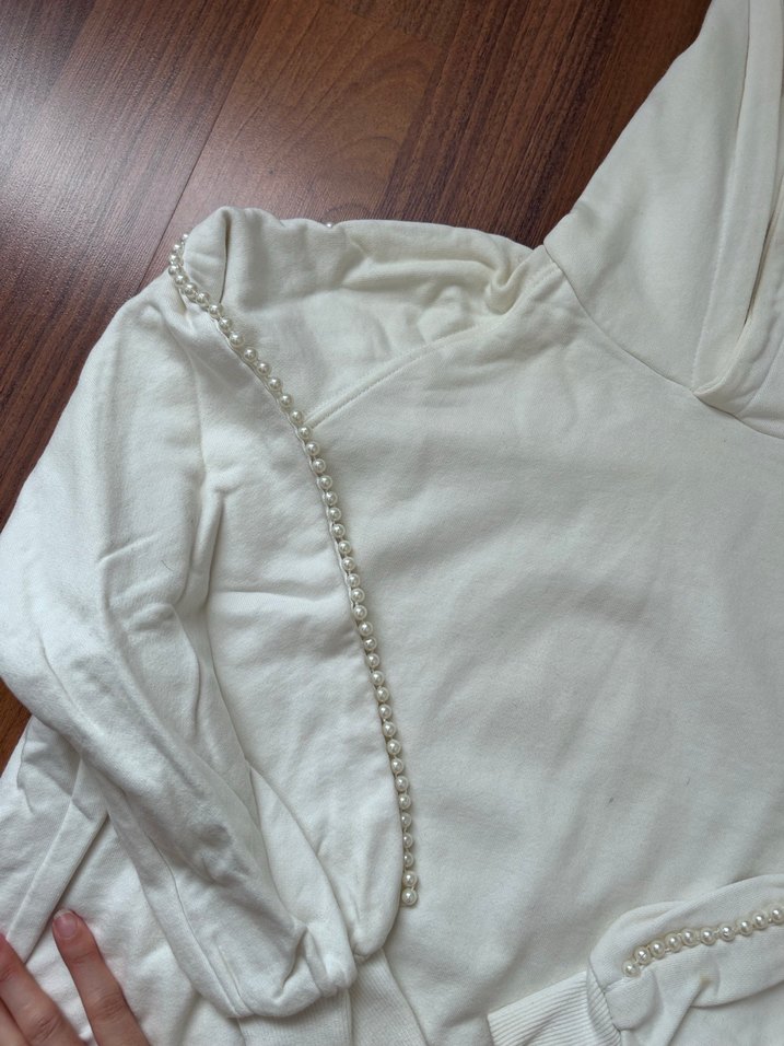 Beyaz, uzun kollu, yuvarlak yakalı, zincir detaylı pamuklu sweatshirt. Rahat ve bol kesimli, günlük rahat stil için uygundur. ✨