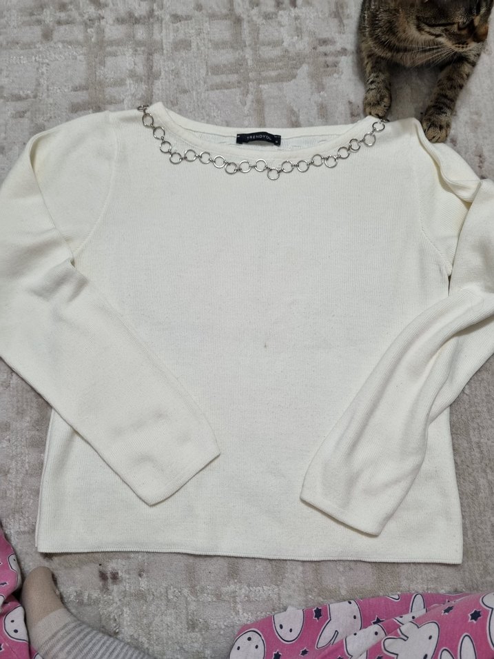 Zincir detaylı yuvarlak yaka beyaz triko kazak, uzun kollu ve bol kesimdir. Günlük kullanıma uygundur. ufak bir lekesi var cikabilir fiyata yansittim