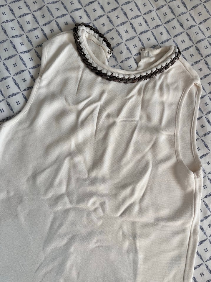 Kolsuz, yakalı ve zincir detaylı beyaz bluz. Yumuşak sentetik kumaştan, bol kesim ve normal boyda, günlük sokak tarzı için uygun.