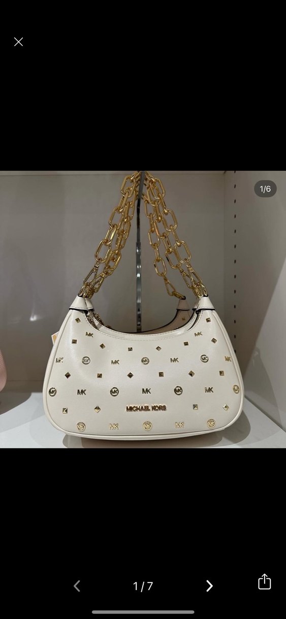 Michael Kors beyaz deri çanta, parlak baskılı detaylar ve zincir saplarla. Sokak stiline uygun, ışıltılı ve şık. Yakindan tum fotograflarini eklemeye calistim sap kisimlarinda bazi lekeler var onun harici zincirde atma vs bir sey yok zaten cok az kullanildi