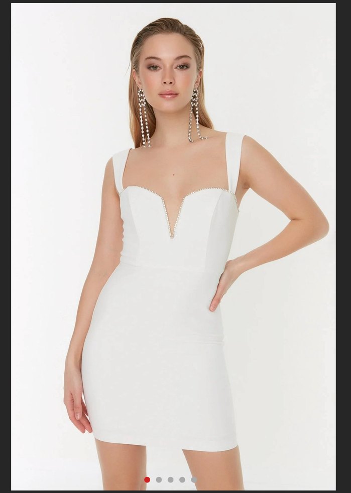 V yaka ve zincir detaylı beyaz mini abiye elbise. Kolsuz, modern klasik tarzda, düğünler için uygun. ✨