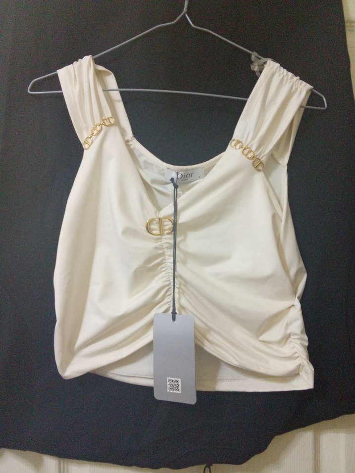 Zincir detaylı omuzları ve ön kısmı büzgülü, ince sentetik kumaştan yapılmış beyaz, straplez, mini kesim kadın staplez Dior marka süper fiyat