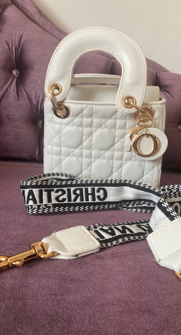 Beyaz deri çanta, kapitone desenli ve altın renk zincir detaylara sahip. Siyah beyaz baskılı askı ile klasik ve zarif tarz için uygun.