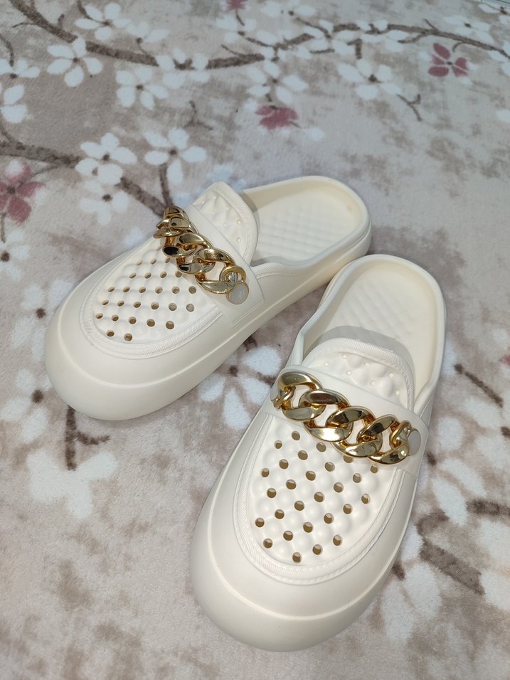 Beyaz, parlak görünümlü, ve zincir detaylı platform terlik. Kauçuk malzemeden, sokak stiline uygun ve günlük kullanıma ideal.