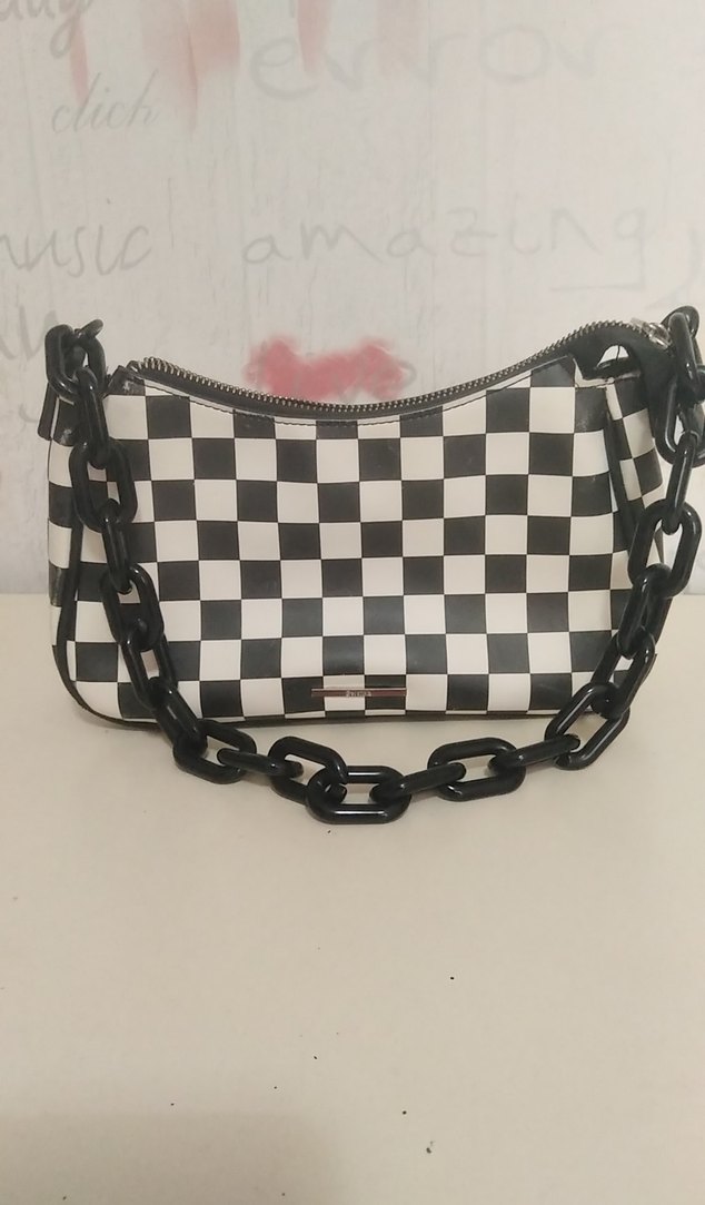 Koyu beyaz ve siyah kareli desene sahip deri çanta, zincir detayıyla rock punk havası yansıtıyor. Paris sokak modasına uygun, günlük kullanıma ideal.