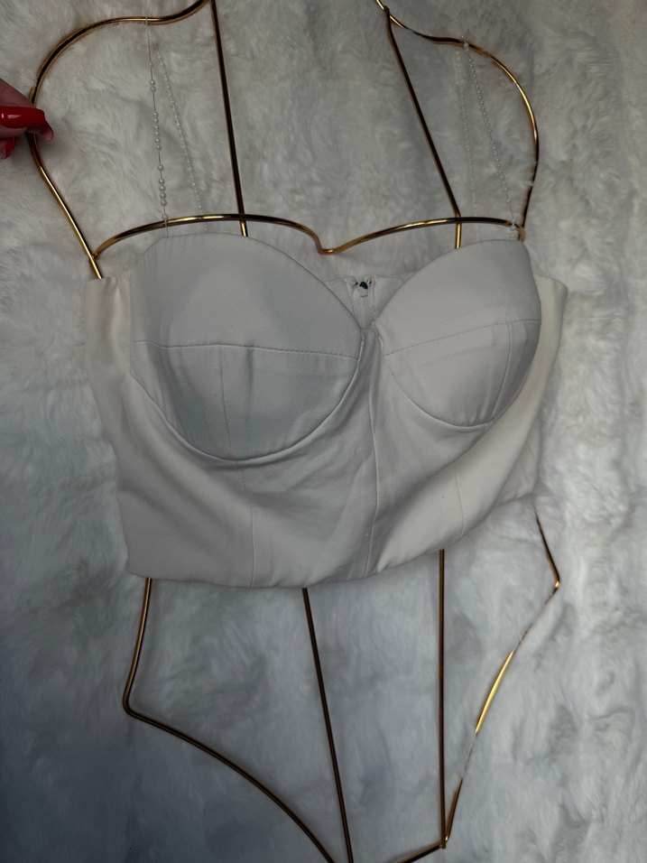 Zincir detaylı, ince askılı, beyaz straplez büstiyer. Avant-garde sokak stili ve parti için uygun, midi boyda ve desensiz.