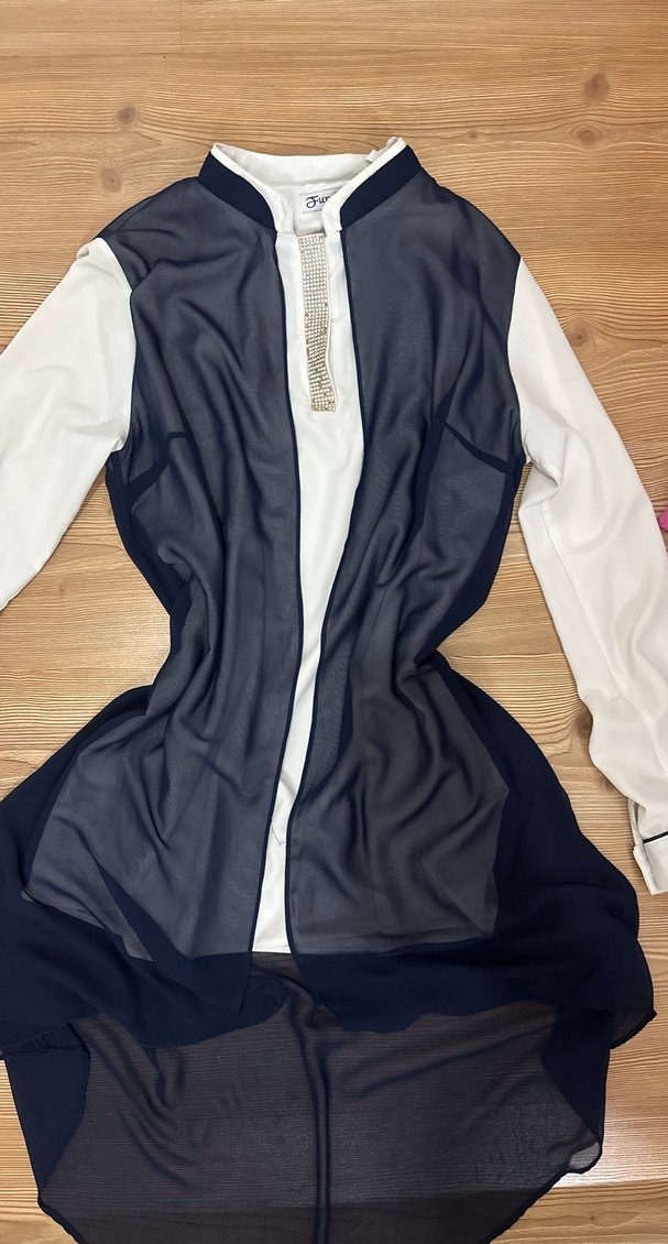 Uzun boylu, V yaka ve uzun kollu beyaz tunik, sentetik kumaştan üretilmiştir. Zincir detaylarıyla ofis kullanımı için uygundur.