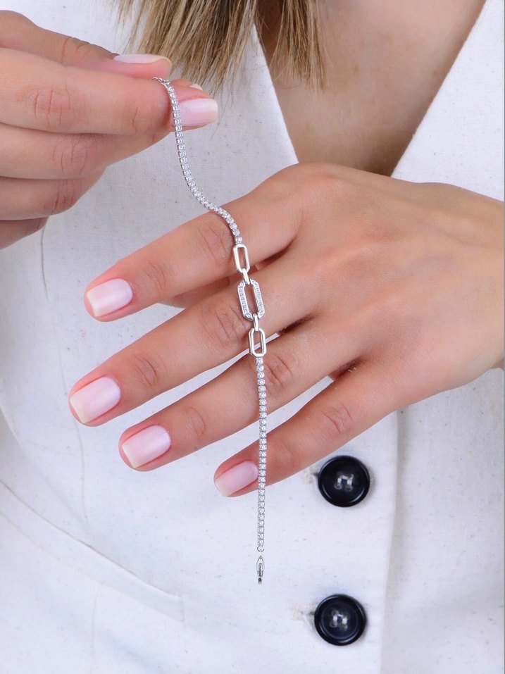 Minimalist ve çağdaş tarzda, zincir detaylı parlak beyaz yılan desenli bileklik, günlük kullanıma uygun şık bir aksesuar.