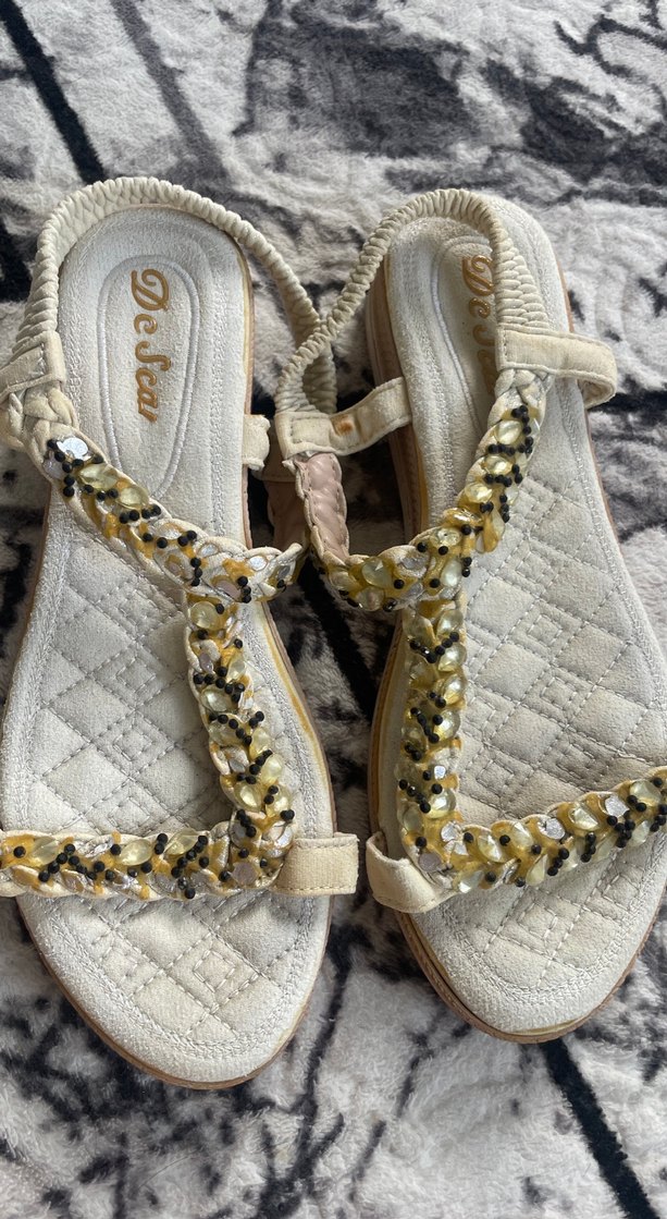Sentetik kumaştan yapılmış, yılan desenli ve zincir detaylı beyaz dolgu topuklu sandalet. Günlük kullanım için bohem tarzda.