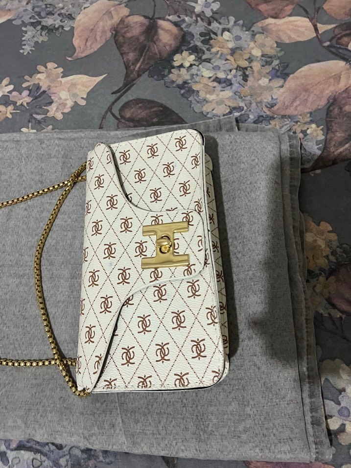Beyaz desenli, zincir detaylı kadın çantası. Sentetik kumaştan üretilmiş, parlak görünümlü, klasik şıklık ve sokak stiline uygun.