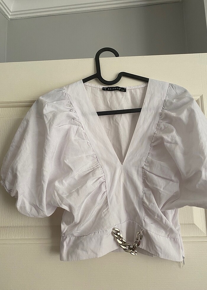 Beyaz v yaka gömlek kumaşlı bluz göbek üstü karpuz kol S beden birkaç defa giyildi