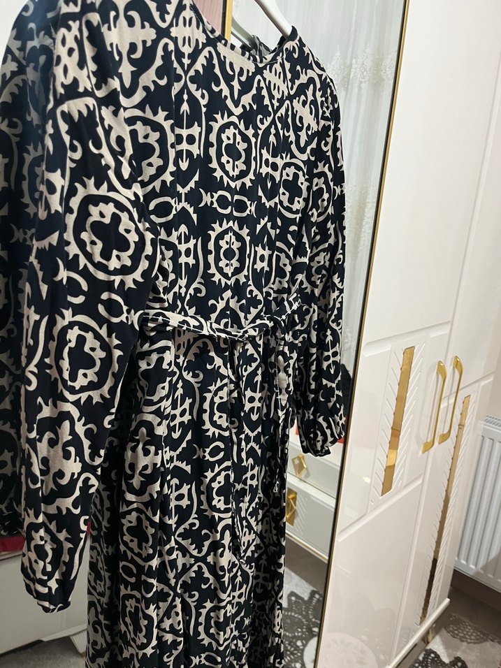 Bu uzun siyah elbise, desenli tekstil kumaş, bol kesim ve uzun kollara sahiptir. Yuvarlak yaka ve zincir detaylarıyla günlük kullanım için bohem, mütevazı Paris tarzını yansıtır.