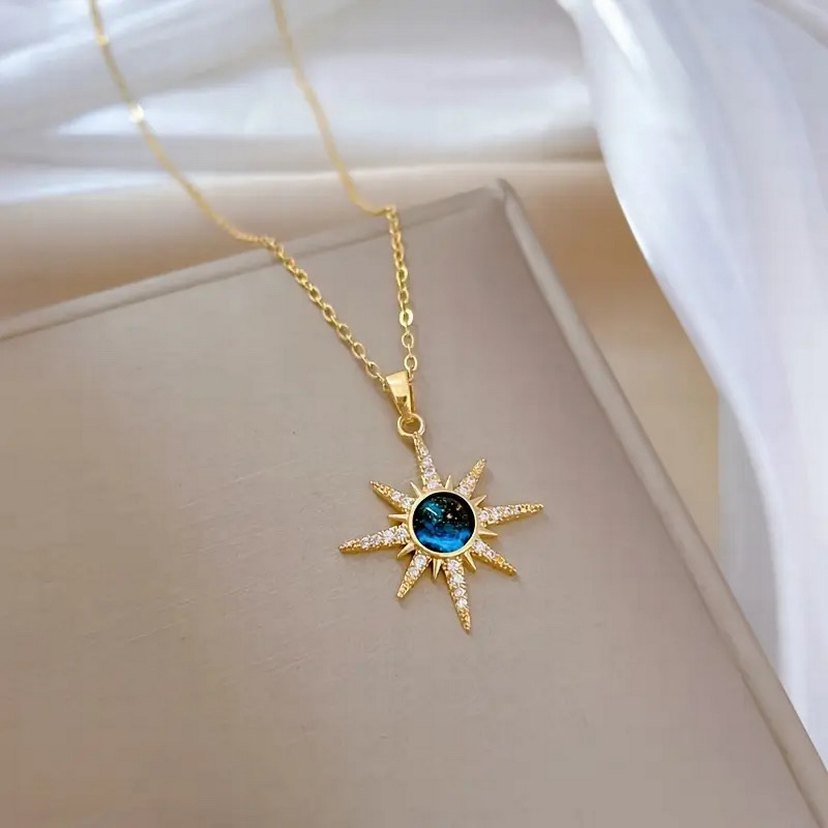 Altın renkli, zincir detaylı kolye; koyu mavi merkezli güneş figürüyle bohem ve minimal tarzı yansıtıyor.