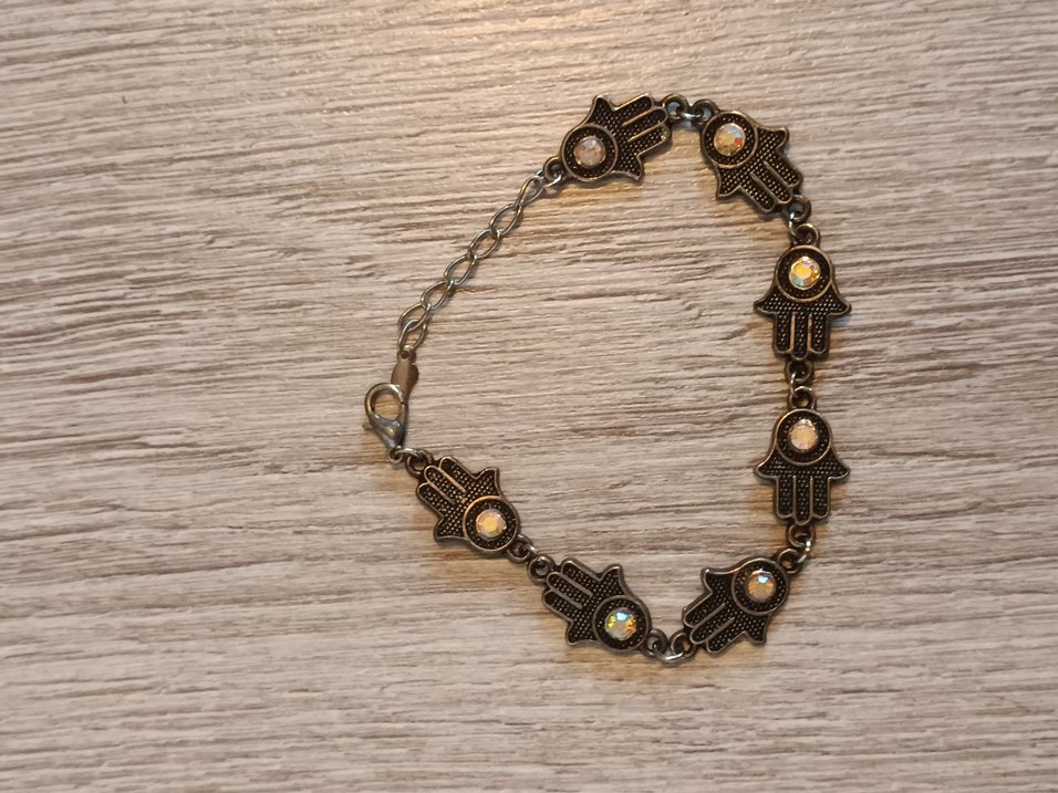 Bohem tarzda, zincir detaylı, altın renkli el figürlü işlemeli taşlı kadın bileklik. Günlük kullanıma uygun. ✨rengi solmuştur