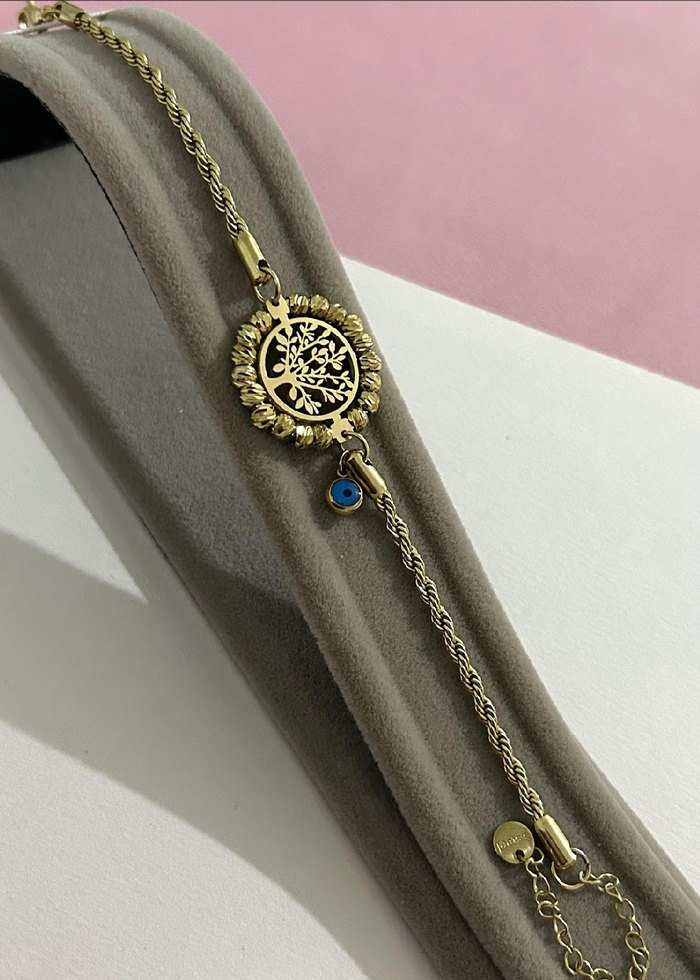 Altın renkli zincir bileklik, bohem tarzında işleme desenli ağaç motifi ve küçük mavi nazar boncuğu detayına sahip, günlük kullanıma uygun.