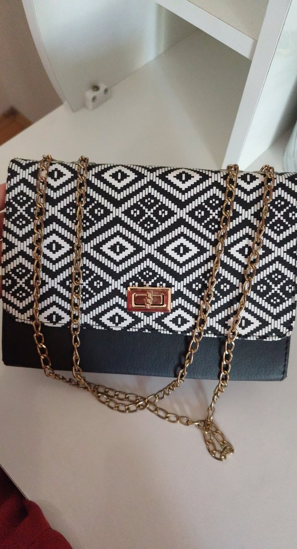 Zincir askılı, siyah-beyaz geometrik desenli, sentetik kumaştan yapılmış bohem tarzda kadın çantası.