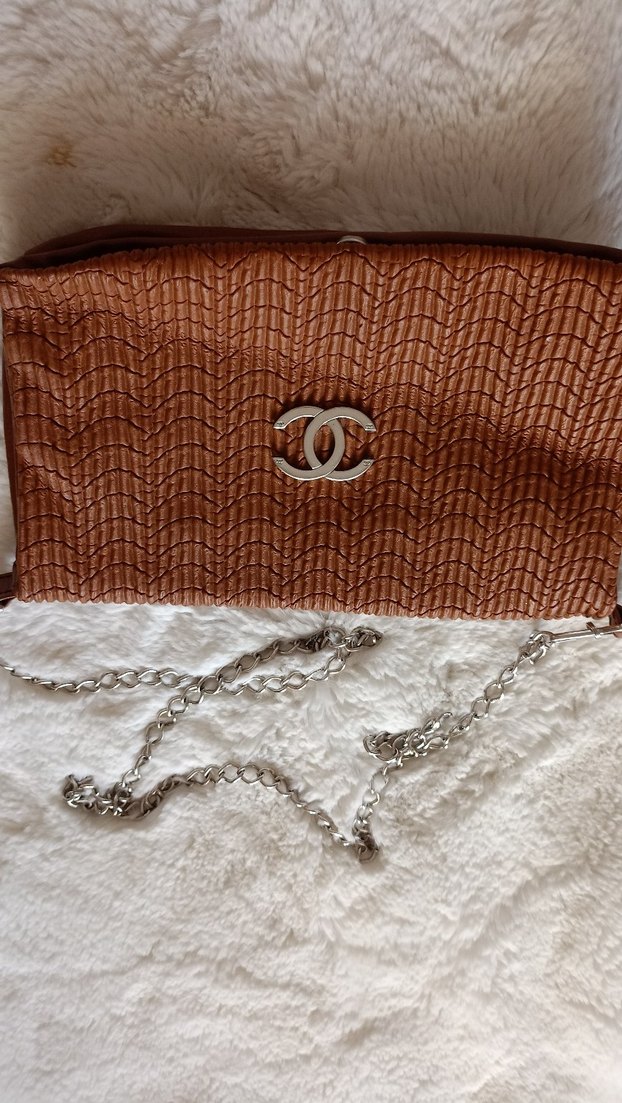 Nakışlı desenlere ve zincir detayına sahip bohem tarzda kadın el çantası. Sıcak kahverengi tonunda, dokulu yüzeyli ve gümüş renk zincir askılıdır.