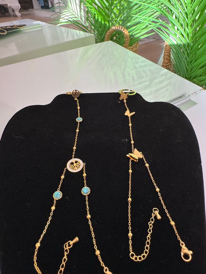 Altın renkli zincir detaylı, nakışlı ve turkuaz taşlı bohem tarzda minimal günlük kullanım el zinciri.