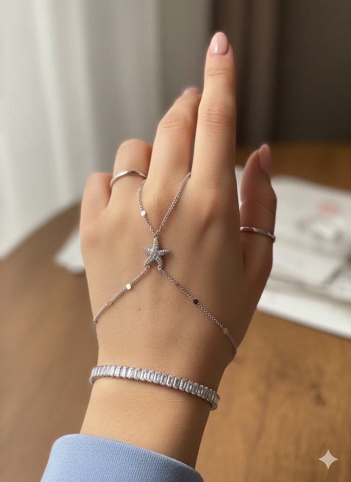 Zincir detaylı, yıldız figürlü gümüş renkli kadın el zinciri, bohem tarzıyla günlük şıklığı tamamlar. ✨
