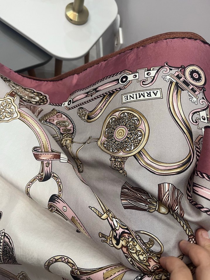 Bordo ve gri tonlarda, zincir detaylı ipek eşarp hiçbir kusuru yoktur. Rengini beğenmediğim için satıyorum