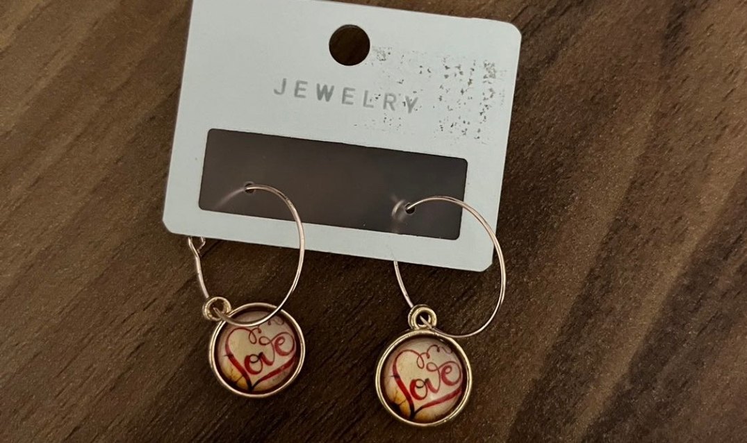 Zincir detaylı, parlak kahverengi desenli "love" yazılı bohem tarzda kadın küpeleri, romantik akşamlar için uygun.