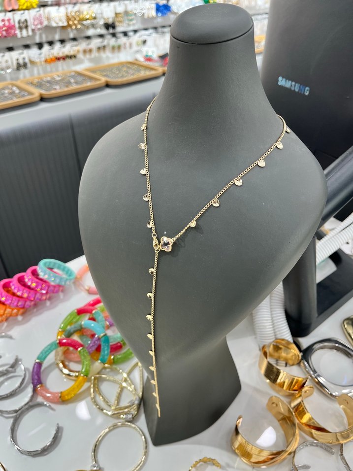 Zincir detaylı, küçük yuvarlak süslemelere sahip uzun altın kolye. Hafif yılan deseni ile bohem ve göz alıcı tarzda günlük kullanım için uygun. Uzun y kolye harika görünüm