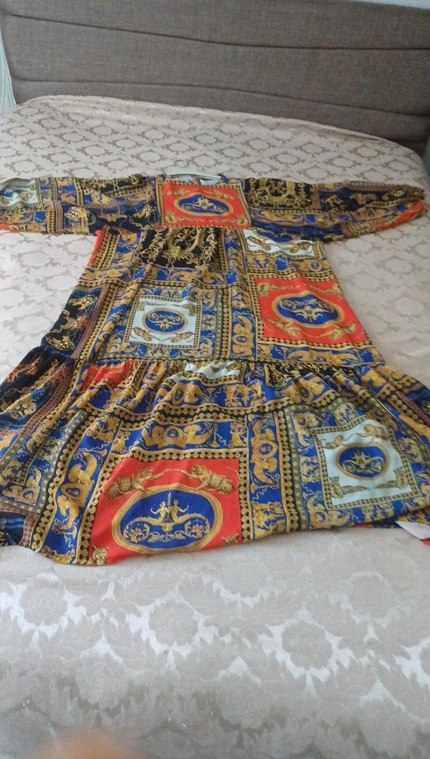 Zincir detaylı, uzun ve bol kesim desenli tekstil kumaştan yapılmış, bohem tarzda bir elbisedir. Uzun kollu ve kayık yaka tasarıma sahiptir.