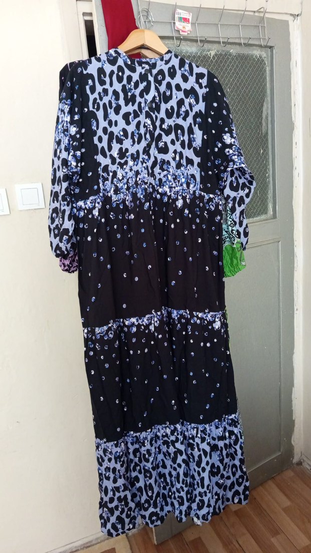 Zincir detaylı, yüksek yakalı, askılı kolları ve çok renkli desenleriyle bohem tarzda uzun, bol kesim elbise.