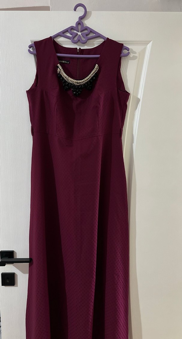 V yaka ve kolsuz tasarıma sahip, zincir detaylı bordo uzun abiye elbise. Ofis kullanımı için uygun, klasik ve şık bir modeldir.✨