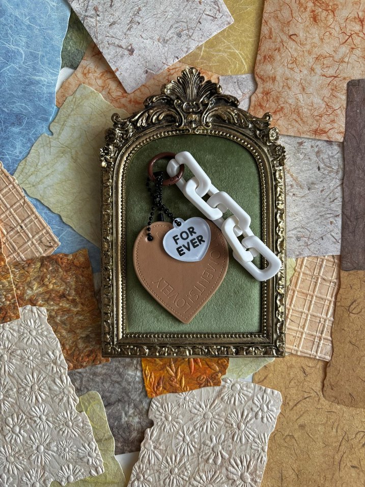 Bej renginde, zincir detaylı ve "FOR EVER" yazılı kalp şeklinde charm taşıyan bohem tarzda anahtarlık. Vintage ve retro sevenlere uygun.