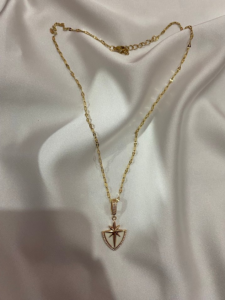 Zincir detaylı, midi uzunlukta altın renk kolye. Kalkan şeklinde yıldız figürlü sade ve şık tasarım. Günlük kullanım için uygun. ✨