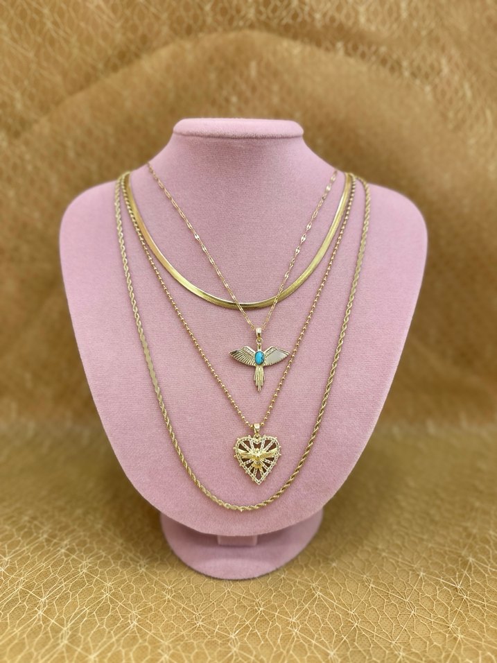 Kısa uzunlukta, zincir detaylı altın kolye seti. Bohem tarzda, yılan desenli kalp ve turkuaz taşlı kuş figürlü uçlar bulunur. Günlük kullanım için uygundur. ✨