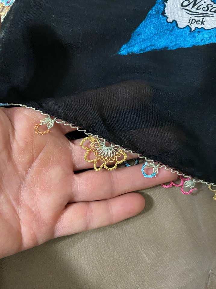 Zincir detaylı, çok renkli tekstil kumaştan yapılmış bohem tarzda kadın fularıdır. Kenarları ince işçilikle süslenmiştir.