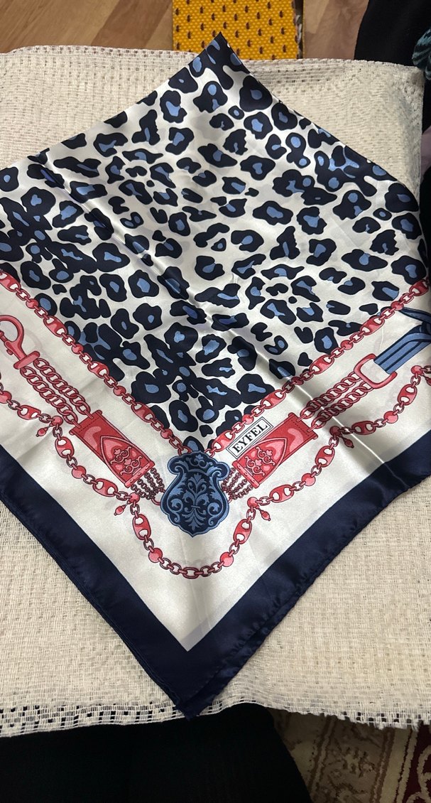 Kadınlar için zincir detaylı, koyu çok renkli desenli, bohem ve retro Paris tarzı sentetik kumaştan fular.