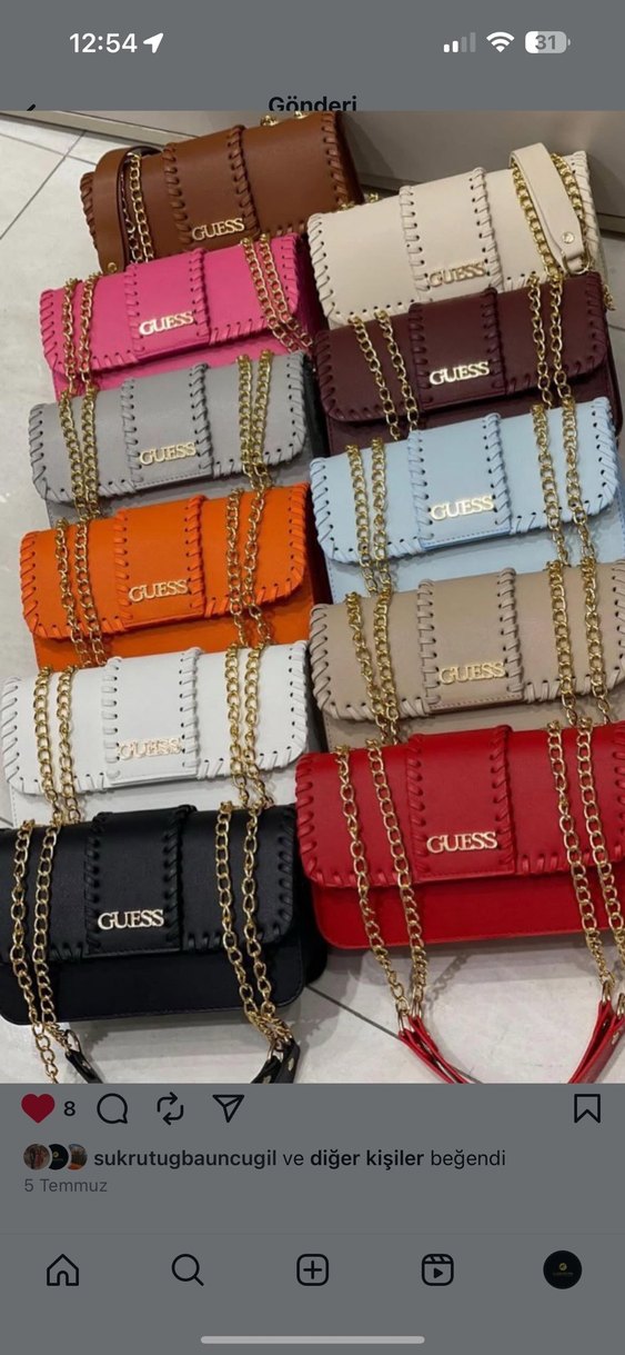 GUESS marka, zincir detaylı, nakış işlemeli çok renkli deri kadın çantası, günlük sokak stili için uygundur.